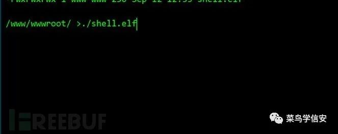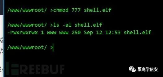 这里的lhost 应为服务器地址 LPORT 为反向代理端口,将shell.elf上传到/www/wwwroot/目录设置权限为777。