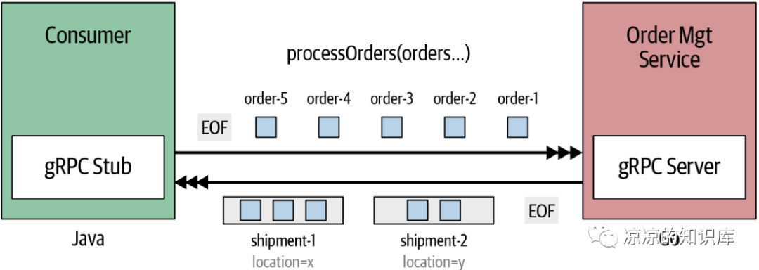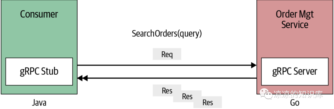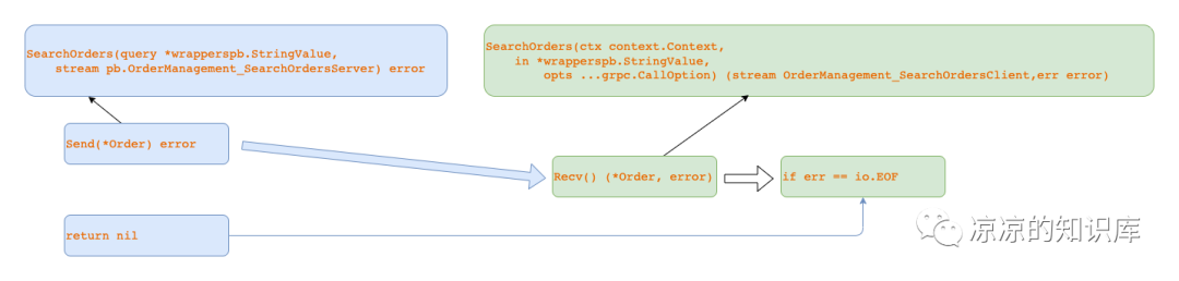 ✨ 注意与Simple RPC的区别:因为我们的服务端是流式响应的,因此对于服务端来说函数入参多了一个stream OrderManagement_SearchOrdersServer参数用来写入多个响应,可以把它看作是客户端的对象