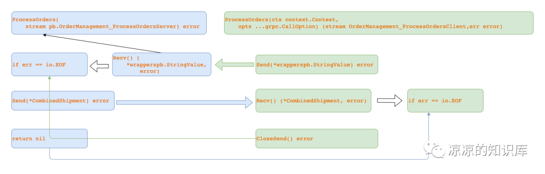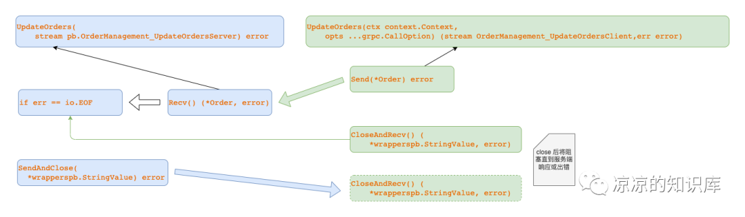 // 当发现 io.EOF (流关闭) 后,需要将最终的响应结果发送给客户端,同时关闭正在另外一侧等待的 Recv