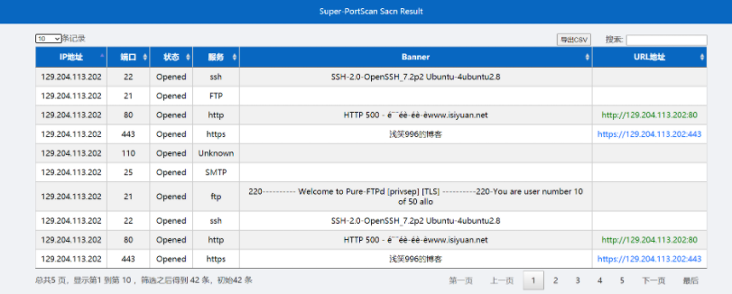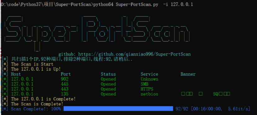 python3 Super-PortScan.py -i 127.0.0.1python3 Super-PortScan.py -i 127.0.0.1-200 -p 80python3 Super-PortScan.py -i 127.0.0.1/24 -p 80,8080python3 Super-PortScan.py -i 127.0.0.1 -p 80-999python3 Super-PortScan.py -i 127.0.0.1 -p 80,111,45-222ip.txt:127.0.0.1/24127.0.0.2127.0.0.3python3 Super-PortScan.py -f ip.txtpython3 Super-PortScan.py -i ip.txt -p 80python3 Super-PortScan.py -f ip.txt -p 80,8080python3 Super-PortScan.py -f ip.txt -p 80-999python3 Super-PortScan.py -f ip.txt -p 80,111,45-222python3 Super-PortScan.py -i 127.0.0.1 -v #显示扫描的全部端口python3 Super-PortScan.py -i 127.0.0.1 -t 100 #执行线程python3 Super-PortScan.py -i 127.0.0.1:443 #单端口扫描python3 Super-PortScan.py -i 127.0.0.1:443 -vip_port.txt:127.0.0.1-3:443127.0.0.1/24:443127.0.0.1-3:442-443127.0.0.1/24:442-443python3 Super-PortScan.py -f ip_port.txt --ip-port#报告生成:python3 Super-PortScan.py -i 127.0.0.1 --txt result.txtpython3 Super-PortScan.py -i 127.0.0.1 --html result.html #数据量较大时不建议使用html。
