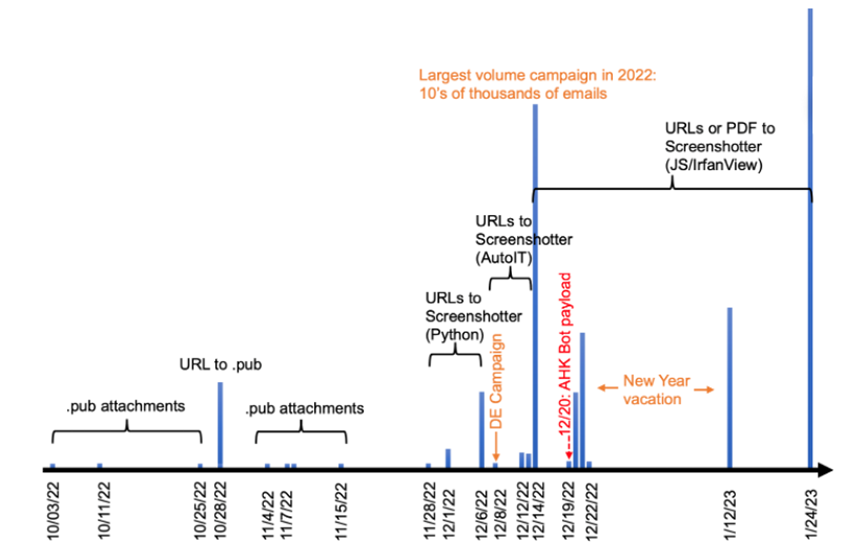 研究人员近期观察到了一个自2022年10月一直持续到2023年1月的系列活动,并将此活动命名为“Screentime”。研究人员评估认为活动由新威胁组织TA866发起,似乎旨在获取经济利益。本次活动感染链始于包含恶意附件或URL的钓鱼邮件,攻击者主要借助包括WasabiSeed和Screenshotter在内的自定义工具集,在安装其它恶意程序前通过屏幕截图方式分析受害者的活动。目前,该活动主要针对美国和德国的组织。