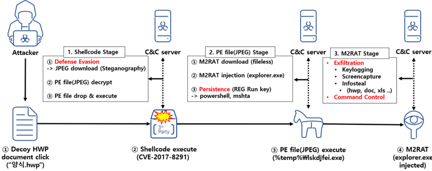 相关研究人员的分析小组在1月份确认,APT37 攻击组织(也称为 Red Eyes、ScarCruft)正在通过 Hangul Encapsulated PostScript (EPS) 漏洞 (CVE-2017-8291) 传播恶意软件。众所周知,APT37 组织不仅窃取个人 PC 信息,还窃取针对特定个人而非公司的手机数据。本次APT37群攻案的主要特征是利用Hangul EPS漏洞,利用隐写技术传播恶意代码。