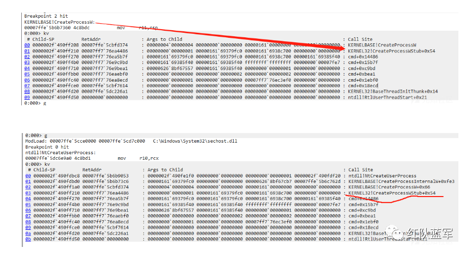断点的调试的流程与上图区分的是对应的。那么从 API 到 NtCreateUserProcess 的调用链 就是kernel32.dll!CreateProcessW-->CreateProcessInternalW-->ntdll.dll!NtCreateUserProcess