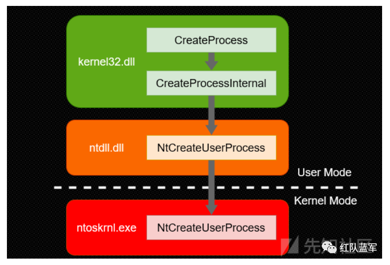 CreateProcess其实是3环的函数,也就是用户态的 而NtCreateUserprocess函数是位于0环内的 网上有画的很直观的图片