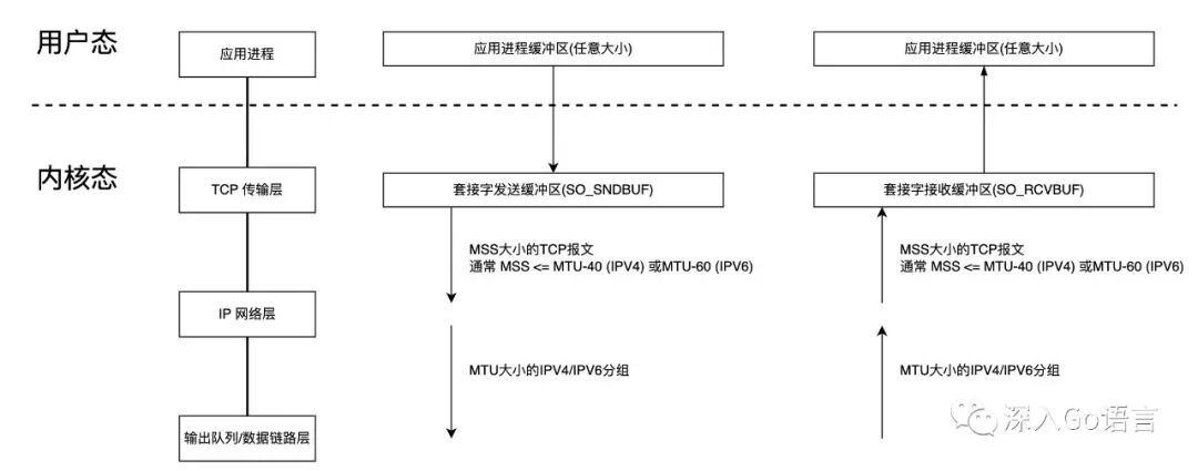 为了方便理解这五种模式的区别,首先需要理解进程和tcp/ip网络栈的交互模式。从套接字read数据或向套接字write数据时,应用进程与套接字的缓冲区进行交互。应用进程运行在用户态,套接字缓冲区在内核态,所以数据的拷贝是必不可少的。流程图如下: