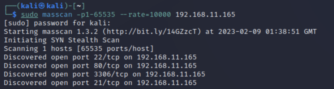 sudo masscan -p1-65535 --rate=10000 192.168.11.165
