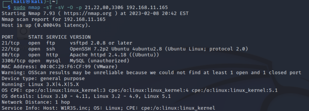 sudo nmap -sT -sV -O -p 21,22,80,3306 192.168.11.165