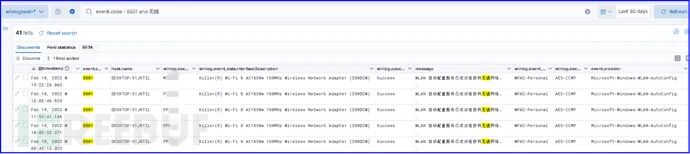 如果企业有封闭网络环境,禁止非法网络外连。作为一种审计措施,将检索“event.code:8001 and 无线”形成如下搜索结果,从而检测是否发生了非法网络外连行为。这种违规行为在封闭网络环境下时有发生,值得特别关注。