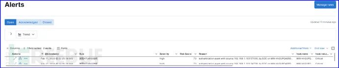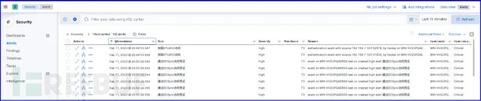 "NTLM V2"(还可以增加更多字段以提高检测的准确度);规则二是将DCsync攻击产生的日志中有关字段(any where event.action=="目录服务访问" and event.code=="4662"and winlog.event_data.AccessMask:"0x100"等)进行关联并设置阈值,经测试产生了相关告警。如果两条规则产生的告警同时出现,更充分说明正在发生PTH和DCsync攻击,如下图所示。
