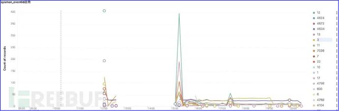 通过对Sysmon每一个EventID事件分析,蓝队将会发现很多有安全价值的信息,对不同EventID进行关联,将会在入侵检测方面有较大的发挥空间。例如,通过监控单个或所有主机Sysmon EventID的走势图,也是可以发现攻击异常。