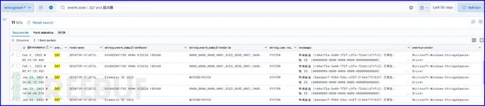 如果企业有封闭网络环境,禁止服务器接入USB存储设备,防止敏感数据被窃取。那么作为一种审计措施,将检索“event.code:207 and 驱动器”形成如下搜索结果,从而检测相关服务器是否发生了失泄密事件。