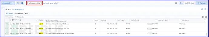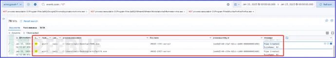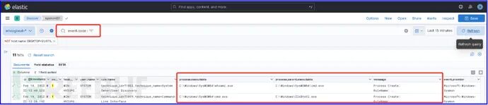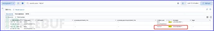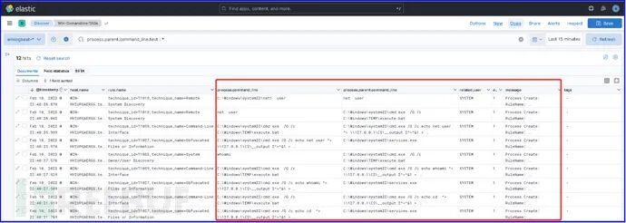 通过Elastic ELK平台集中分析主机层面攻击行为,搜索eventID为1的事件,下图显示了红队执行psexec.py攻击及whoami命令后,在靶机上产生了2个进程。
