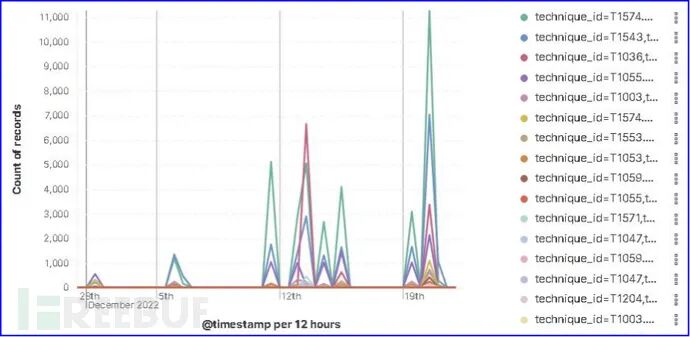 同Sysmon EventID走势图一样,蓝队也可以通过监控单个或所有主机“TechniqueID”走势图来发现攻击行为或其他异常。