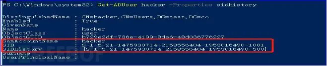 SID history是攻击者用到的比较隐蔽的一种权限维持方法。蓝队应当经常检查域控是否有账号存在500 SID history权限,可通过powershell命令排查(Get-ADUser -Filter "SIDHistory -like ''" -Properties SIDHistory| ` Where { $_.SIDHistory -Like "-500" })。