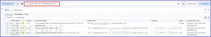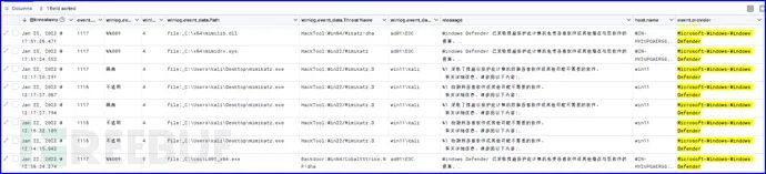 如果企业使用Windows Defender防病毒软件,那么可以将Defender日志集中收集分析。检索“event.code:1116”和“event.code:1117”形成如下搜索结果,从而快速发现恶意文件和攻击行为。