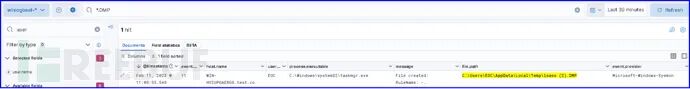 结合Sysmon EventID 11或直接查找lsass.dmp文件,或通过ELK自定义搜索结果来快速检索。如下图所示,检测到lsass内存转储行为。值得注意的是,测试发现mimikatz shell里执行的命令,Sysmon并没有相关日志记录。