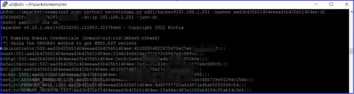 假设红队导出上述的某个账号密码属于域管理员组或具有DCsync权限,则可使用secretsdump.py来导出域控AD目录所有账号及密码哈希。