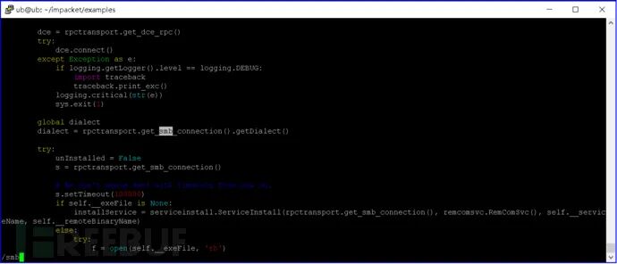 通过查看psexec.py代码,可以深入了解其工作原理。下图代码展示了psexec.py首先会使用SMB协议进行会话协商,通过可写共享上传随机文件名的exe文件,随后打开SVCManager并创建服务,之后启动服务与远控端建立通信连接。
