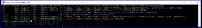 模拟红队使用crackmapexec套件工具,利用已获得账号及其哈希值,进行哈希传递攻击。下图显示发现有两个系统存在相同的账号密码。