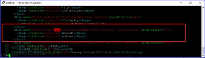 红队在攻击Linux系统后,有可能会创建账号。Sysmon for Linux可以检测此类攻击行为,修改Sysmon配置文件,添加如下图所示检测规则,可检测Linux账号创建行为。