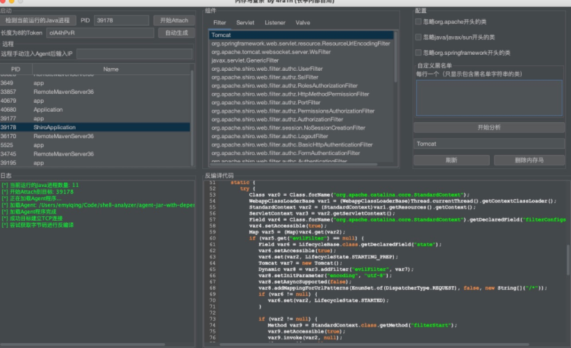 关于Java Web内存马查杀的文章和工具已经有不少,不过大都不够完善,各有缺点;于是我做了一款GUI版本的实时内存马查杀工具,支持本地查杀与远程查杀;仅测试了Tomcat这一种中间件,不过理论上任何实现了Servlet规范的中间件都可以查杀,优势:实时监控目标JVM,一键反编译分析代码,一键查杀内存马。