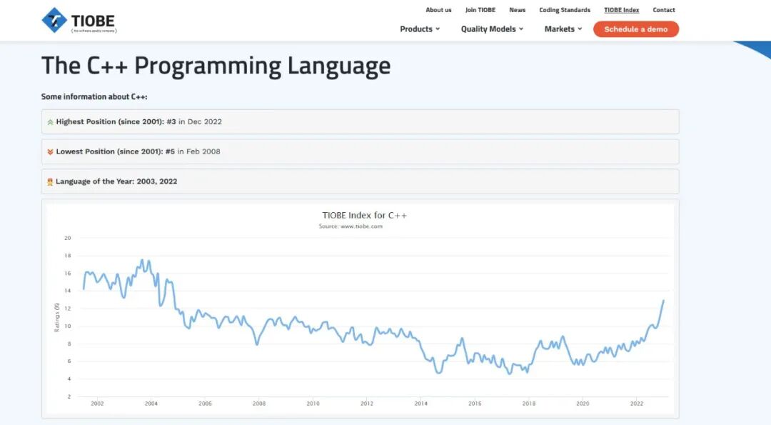 我特地上TIOBE看了看,意外发现一件非常有意思的事。TIOBE指数行业内的同学都很熟悉,是全球编程语言流行度的风向标。TIOBE最早始于2001年,但当年并没有选出年度语言,而是得等到2003年。2003年对于C++也是特别的一年,C++在TIOBE上的流行指数一度逼近18%,可谓如日中天,所以毫无悬念,第一届年度语言就是C++。