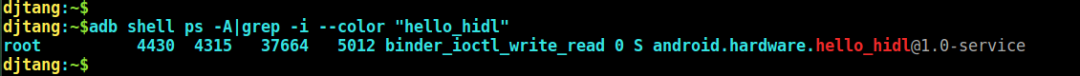再执行adb shell ps -A|grep -i --color "hello_hidl"命令看下这个服务状态