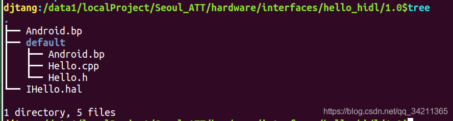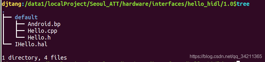执行命令成功之后我们会发现hardware/interfaces/hello_hidl/1.0下多了一个default目录,进入default目录,里面有三个文件Android.bp,Hello.cpp,Hello.h