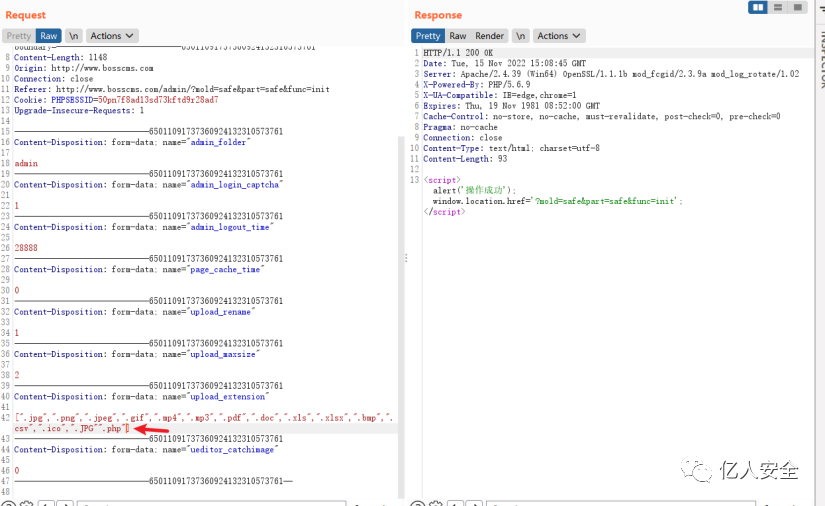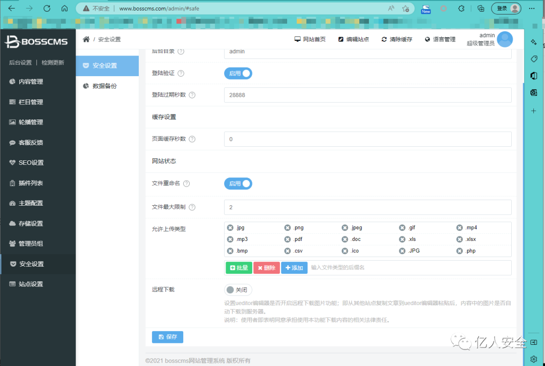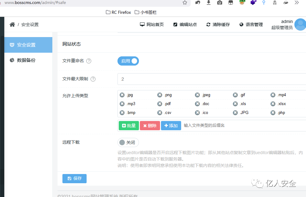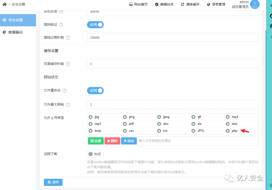我们在后台查看功能点的时候,发现一处可以编辑上传类型的地方,这里添加一个允许上传后缀.php,