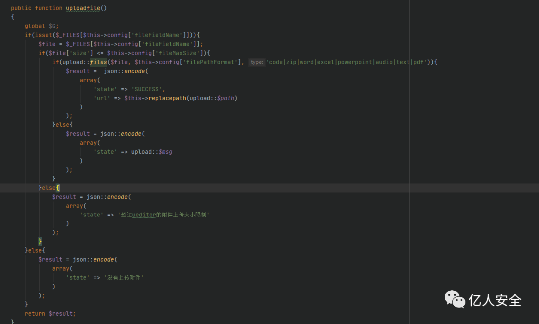 而在uploadfile()方法中就一目了然了,该处调用files()方法并且可以上传code类型下的后缀文件,而