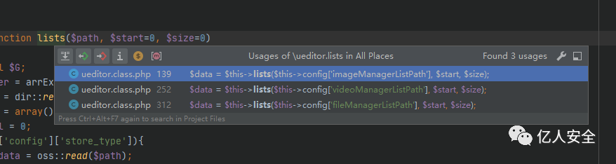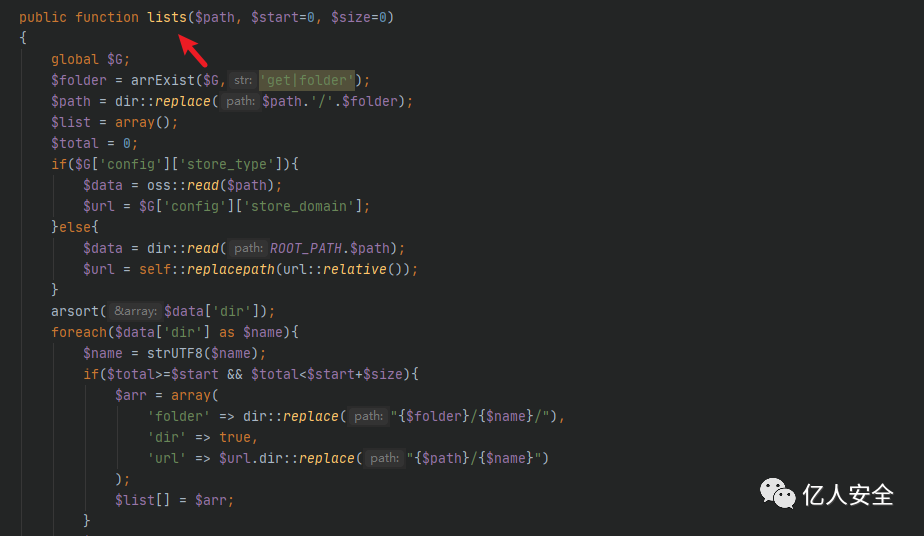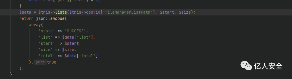 我们接着翻找 ueditor.class.php 文件下的方法时,找到一处 lists() 方法,在代码327行处