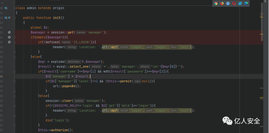 在调用admin类下的 init() 方法中通过session类下的 get() 方法获取登录后的session,如果读取不到session的话get()方法则返回false,那么这里就会进入到16行的if条件,在17行判断是否定义IS_LOGIN 常量,如果未定义则通过header()进行跳转,在跳转后代码仍然会继续向下执行而没有使用die()函数结束下面语句的执行。![]()