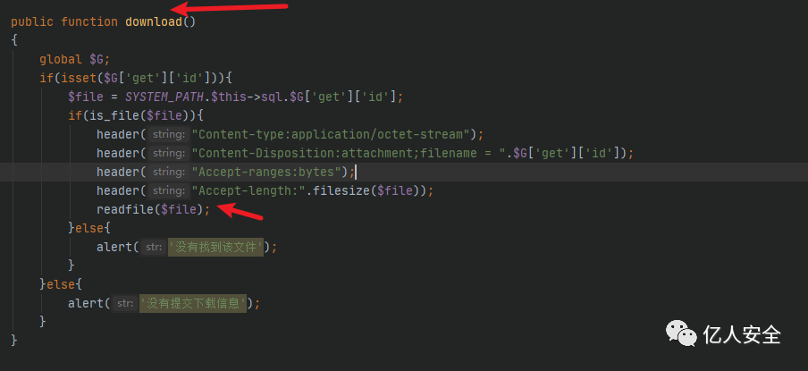 通过上面的路由分析我们不难找到这里的 download() 方法,这里通过66行GET传入 id 参数,在67行将