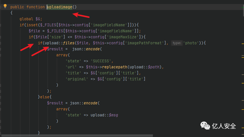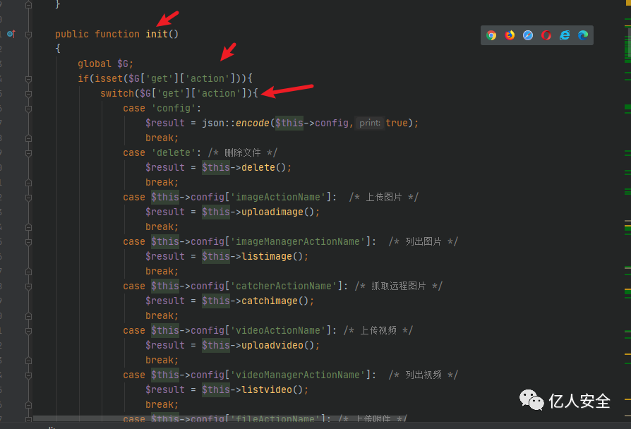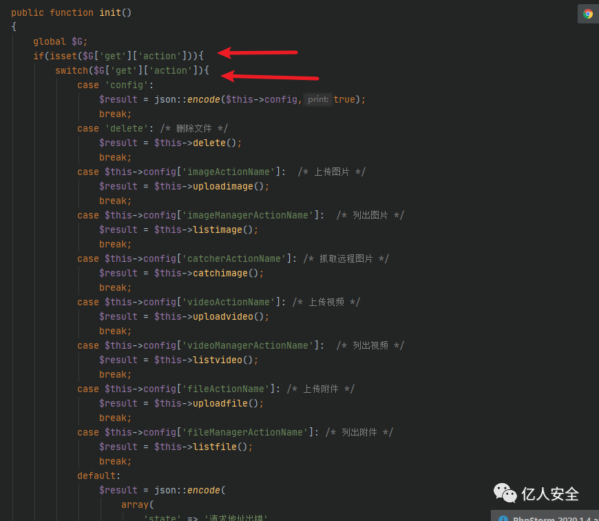 通过路由找到功能点文件ueditor.php下ueditor类下的init()方法,上面的路由中传入了