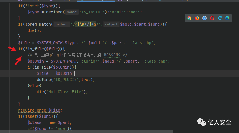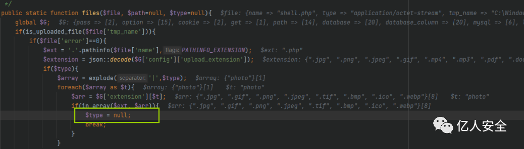 $t是遍历$arrary获得的,而$array是分割$type获得的,可以看到files函数调用时$type默认值是null,那么就是调用时指定code值