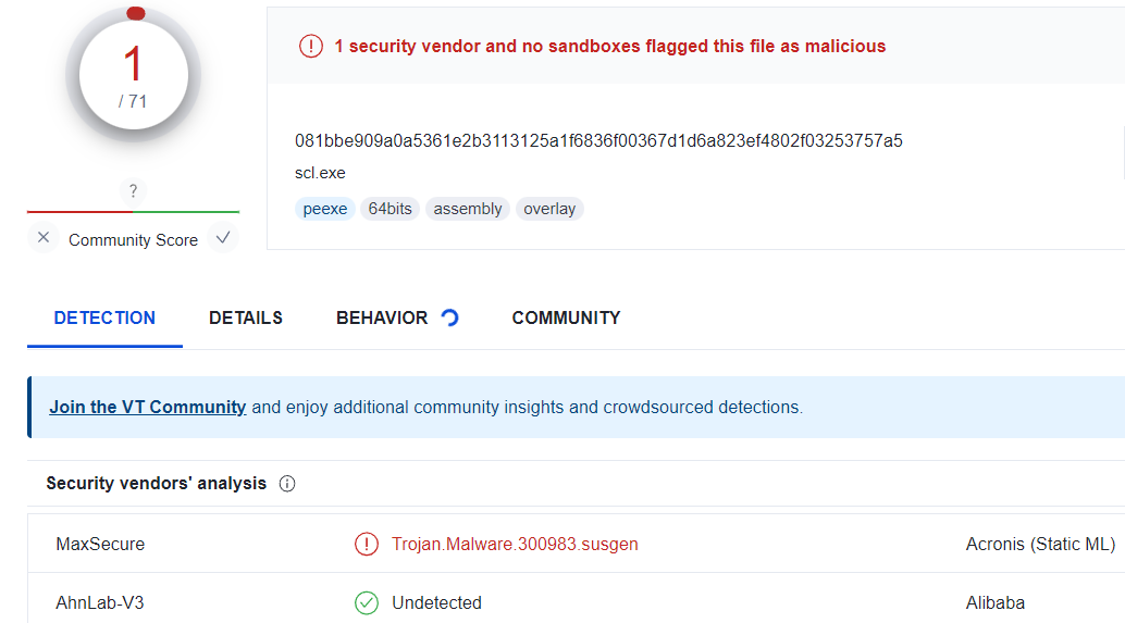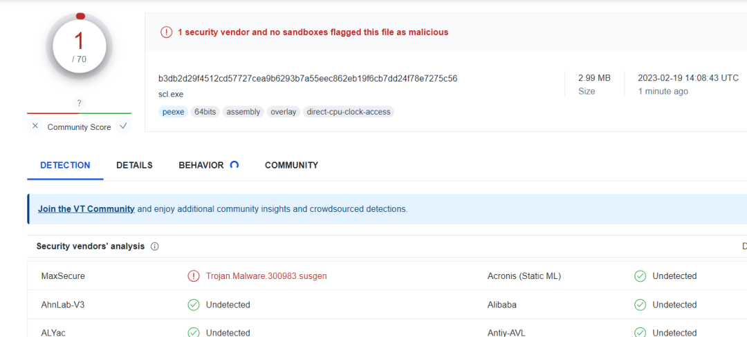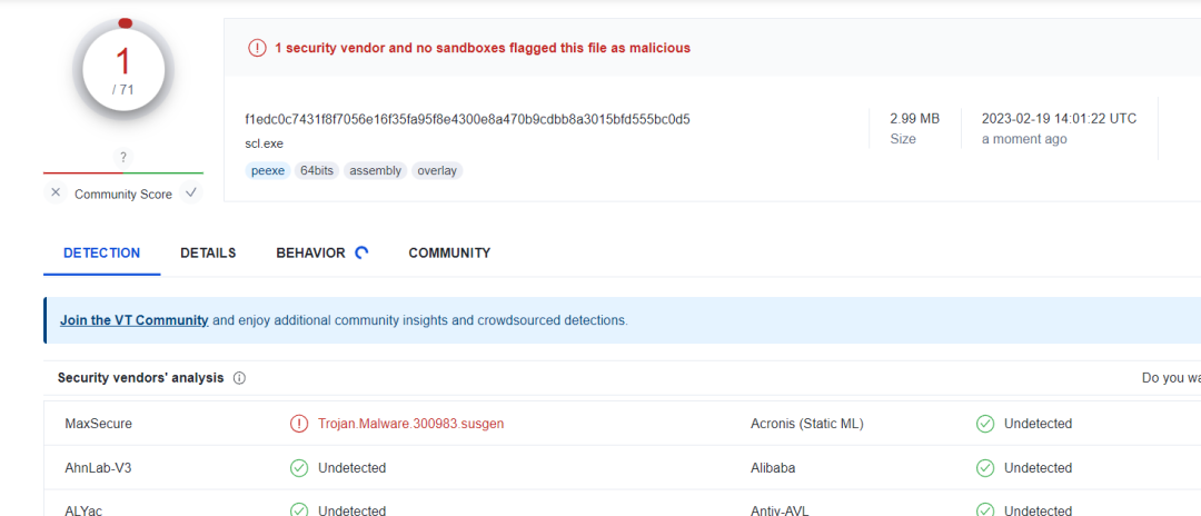 的确是还有一个,本来我觉得VT 1/71已经够了,但我觉得还是可以研究一下,在我的印象里剩下这个MaxSecure只要是g++打包的exe都会报毒。