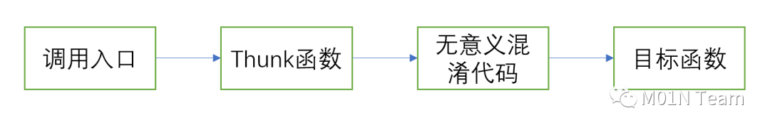 在实现上,Mafalda通过thunk函数在非混淆代码前插入一段无意义的混淆代码,其调用逻辑如下: