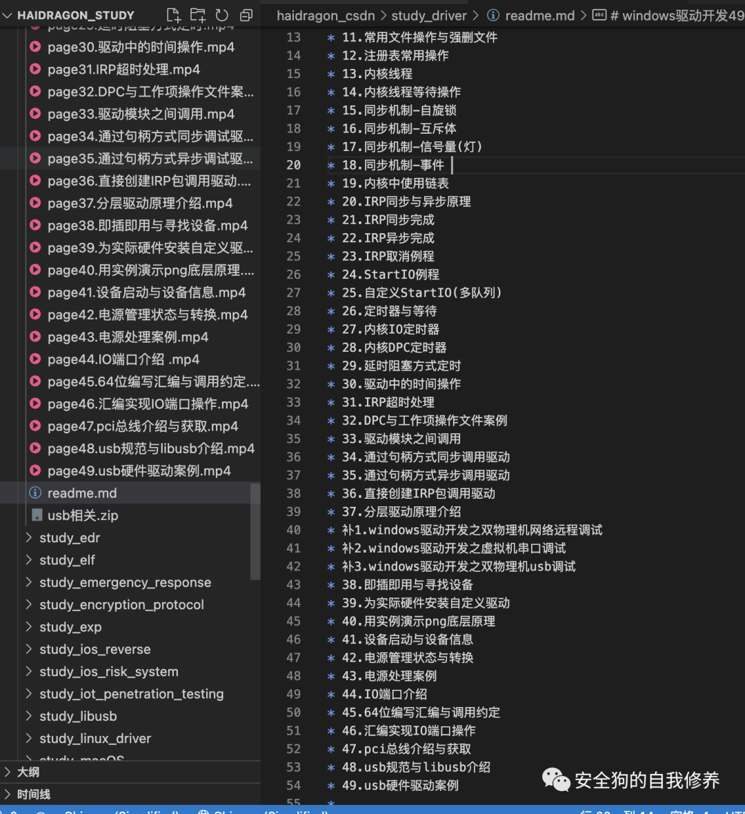 公众号:安全狗的自我修养github.com/haidragon# linux驱动开发视频教程(基于Ubuntu)* 1.视频介绍* 2.驱动开发环境工具准备* 3.最新内核源码编译安装* 4.helloworld编写与安装* 5.双虚拟机驱动源码调试* 6.操作系统与指针回顾* 7.vscode编写驱动搭建* 8.linux驱动的分类* 9.字符驱动模型* 10.字符驱动IO例程* 11.编写用户调用内核模块* 12.内核创建线程* 13.内核进程上下文* 14.同步机制-互斥锁* 15.同步机制-读写锁* 16.同步机制-自旋锁* 17.同步机制-信号量* 18.同步机制-条件变量* 19.同步机制-屏障* 20.ioctl控制例程* 21.内核中的数据结构* 22.内核中错误处理* 23.驱动模块之间通信* 24.阻塞IO* 25.poll与select* 26.异步通知* 27.时间操作* 28.定时器* 29.tasklets机制* 30.工作队列* 31.内核中内存操作* 32.IO端口介绍* 33.64位编写汇编与调用约定* 34.汇编实现IO端口操作* 35.pci总线介绍与获取* 36.usb设备基础* 37.linux设备模型* 38.热插拔事件* 39.内核内存映射* 40.块驱动注册* 41.网络驱动开发* 42.TTY驱动开发