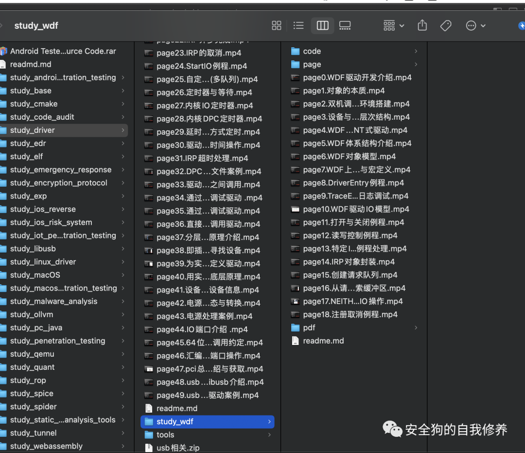 公众号:安全狗的自我修养github.com/haidragon# WDF驱动开发视频教程* 0.WDF驱动开发介绍* 1.对象的本质* 2.双机调试开发环境搭建* 3.设备与驱动的层次结构* 4.WDF写原NT式驱动* 5.WDF体系结构介绍* 6.WDF对象模型* 7.WDF上下文与宏定义* 8.DriverEntry例程* 9.TraceEvents日志调试* 10.WDF驱动IO模型* 11.打开与关闭例程* 12.读写控制例程* 13.特定IRP包例程处理* 14.IRP对象封装* 15.创建请求队列* 16.从请求检索缓冲区* 17.NEITHER方式IO操作* 18.注册取消例程* 19.IO操作Parallel模式* 20.IO操作Manual模式* 21.WDF驱动字符串对象* 22.WDF驱动注册表对象* 23.WDF驱动事件对象* 24.WDF驱动锁对象* 25.WDF定时器对象* 26.利用定时器IO操作* 27.WDF驱动工作项对象* 28.WDF驱动链表对象* 29.WDF驱动文件对象* 30.WDF驱动内存对象* 31.可配置设备资源对象* 32.电源管理* 32.WDF过滤驱动介绍* 33.不同驱动之间通信* 34.USB设备开发* 35.PCI设备访问* 36.
