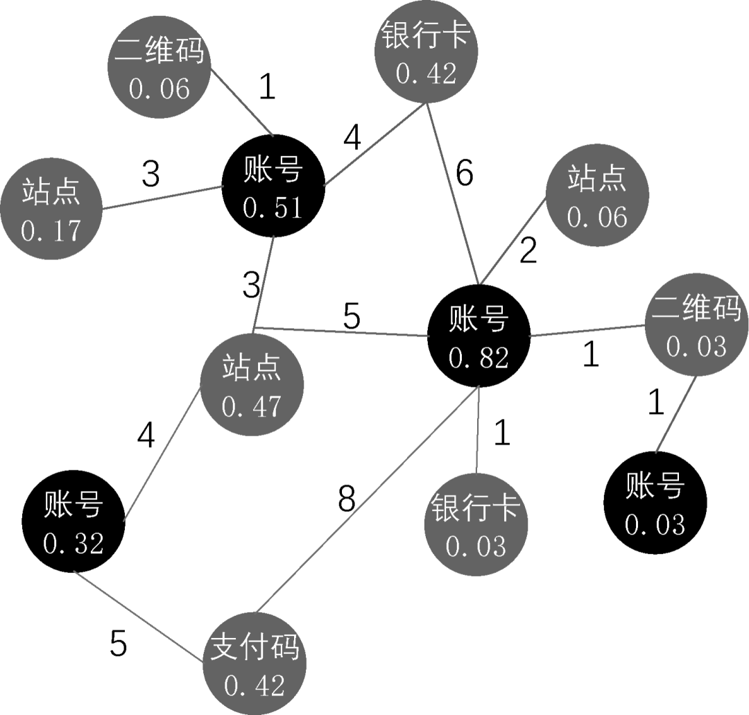 无论黑产怎样实施诈骗活动,他们最终是要将非法所得收入囊中的,那么由这些虚假账户、站点、银行卡号、支付宝/微信收款二维码作为点,诈骗活动作为边,就可以构成一张传播网络。