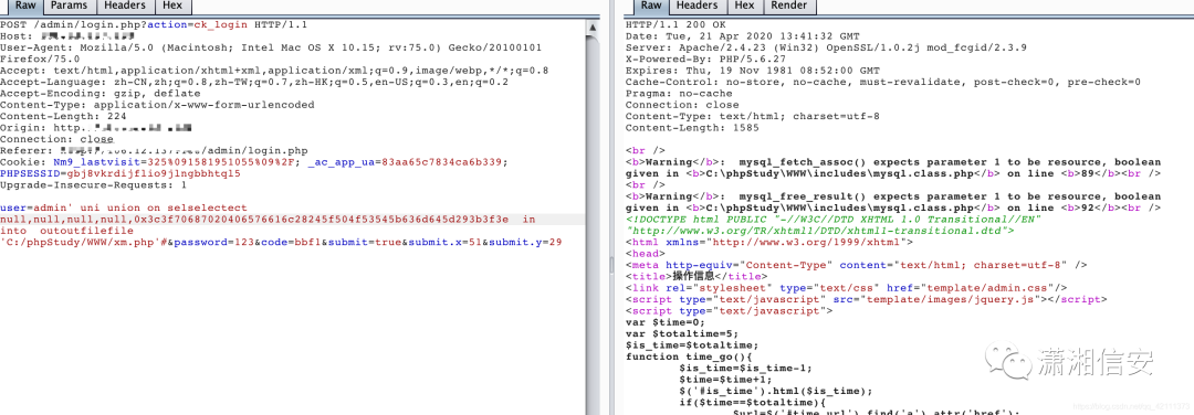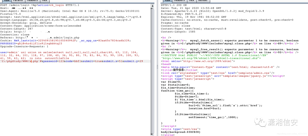 5. 发现这个注入点后,就有各种各样的注入方式了,通过sql语句写入一句话,sqlmap一把梭,手工注入得到账号密码等等,怎么方便怎么来,这里我把几种方法都写一下,看看那种方法可以