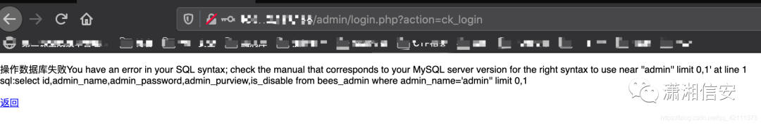3. 通过通用漏洞发先后台管理处存在sql注入漏洞,直接输入admin’,然后就会报错,这里用万能密码不能登陆,看来还是得通过上面得通用漏洞来进行注入