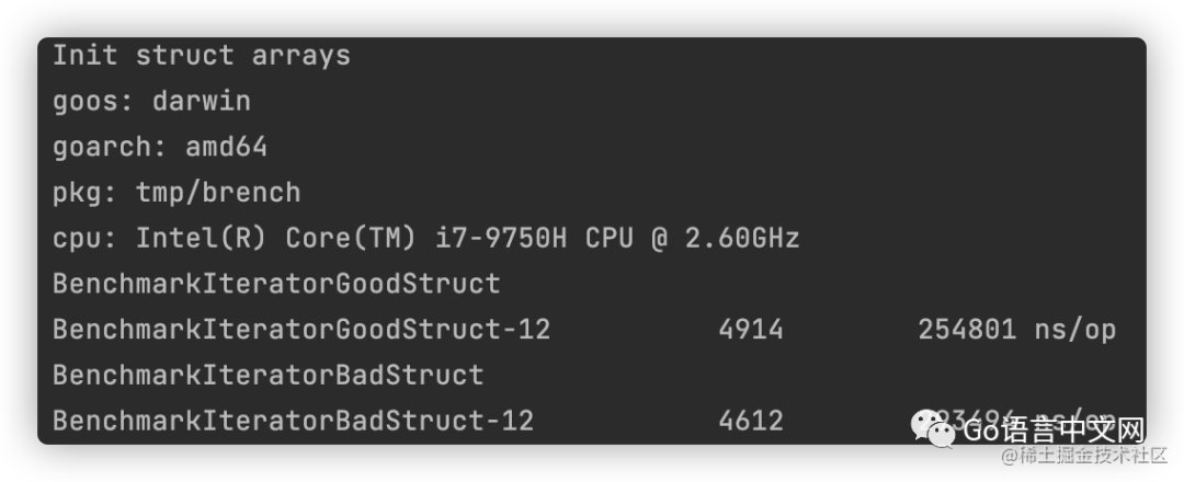 从结果您可以看出,遍历 GoodStruct 花费的时间确实更少。重新排序结构体字段可以提高程序的内存使用率和速度。