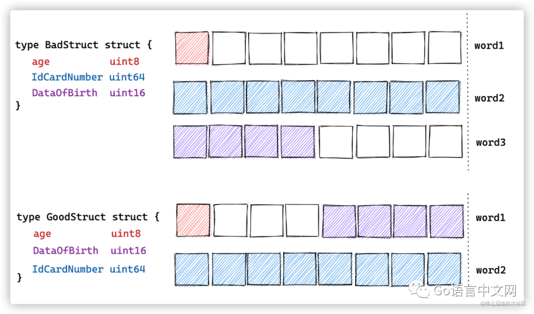 GoodStruct 消耗更少的内存,仅仅是因为它比 BadStruct 有更好的结构体字段顺序。