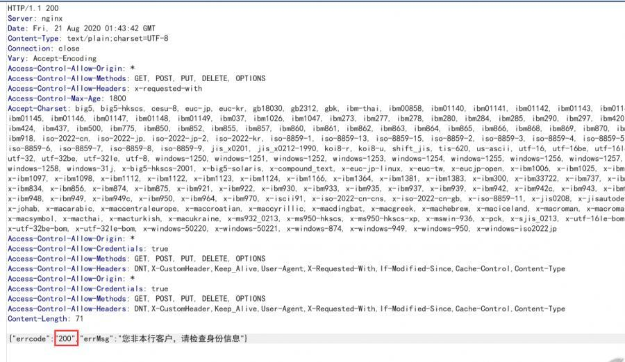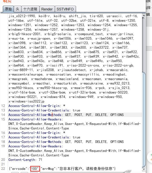 这里我们针对这几个功能点,首先想到的就是 能不能绕过他这个验证流程呢(流程验证绕过漏洞)?我们在身份信息验证处尝试修改返回包状态码,从而绕过验证流程。正常返回包中,因为输入错误信息,所以返回"100";