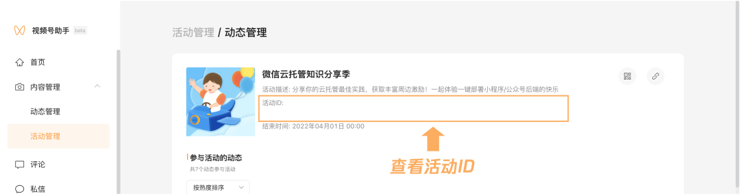 wx.openChannelsEvent({finderUserName: "yourfindusername", // 视频号 IDeventId: "eventid", // 活动 id,可在「视频号助手」-「内容管理」-「活动管理」获取})