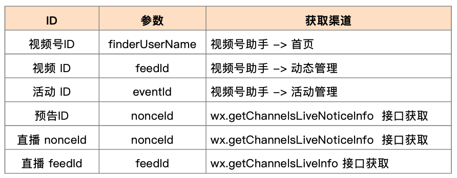 // page.js 获取视频号直播信息wx.getChannelsLiveInfo({finderUserName: "yourfindusername", // 视频号 IDstartTime: "", // 起始时间endTime: "", // 结束时间success(res) {res.feedId // 直播 feedIdres.nonceId // 直播 nonceIdres.status // 直播状态,2: 直播中、3: 直播结束res.description // 直播主题res.replayStatus // 视频号回放状态,0: 未生成、1: 已生成、3: 生成中、6: 已过期res.otherInfos // 除最近的一条直播外,其他的直播列表}})