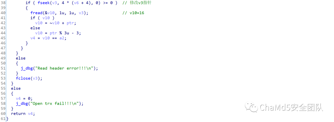 根据分析可以发现,v3打开了文件后,用fseek做了一下指针的移动,注意根据fseek函数定义,该指针是从文件尾开始移动的。之后用fread读取了0x40个字节至v17空间。根据v17和v21在栈上的偏移得知,二者相差0x24,因此v21所在的字节就是从文件末尾起,0x40-0x24=0x1C处。也就是固件FOOTER字段里的最后一个非00值。